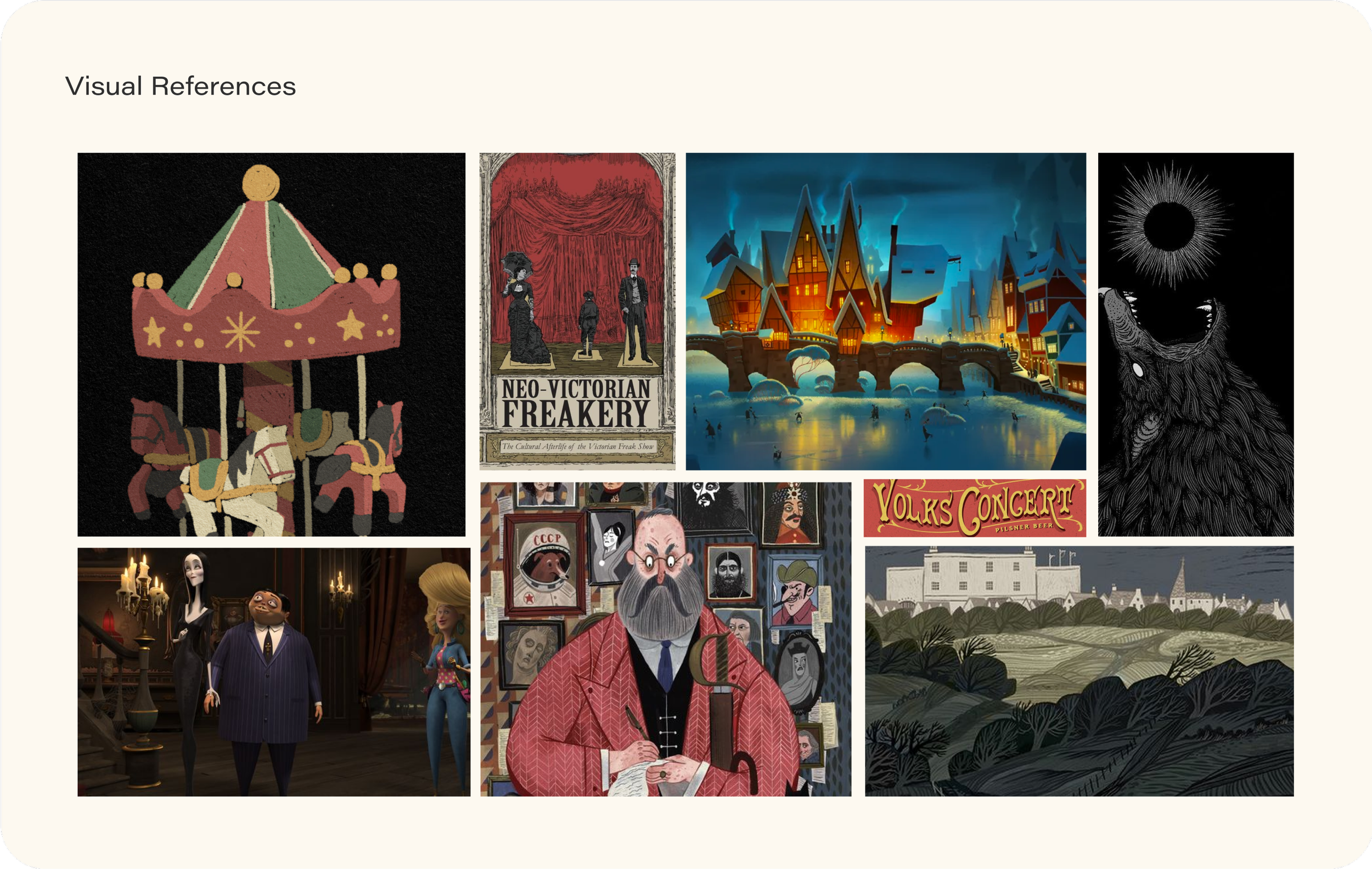 The book takes place during the Victorian London era, and the primary colors in the circus are black, white, and gray. Some keywords for the illustration style include whimsical, dark gothic, beguiling, and dramatic.